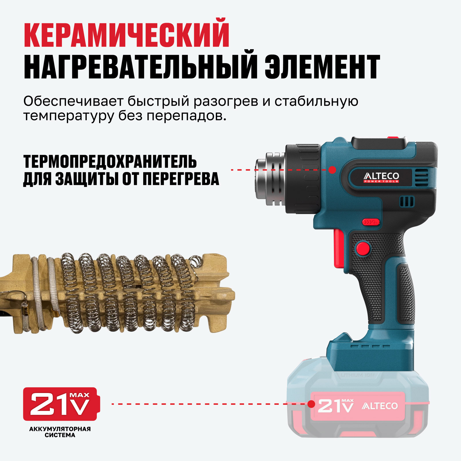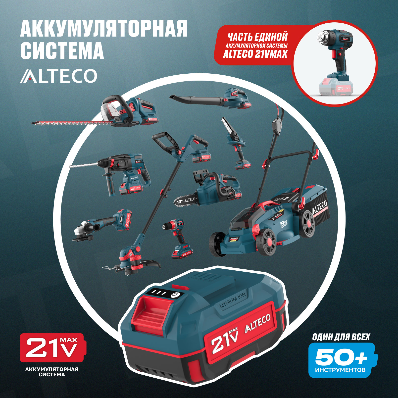 - Часть единой аккумуляторной системы ALTECO 21Vmax — один аккумулятор подходит для всех инструментов этой серии, обеспечивая удобство, экономию и гибкость в работе.