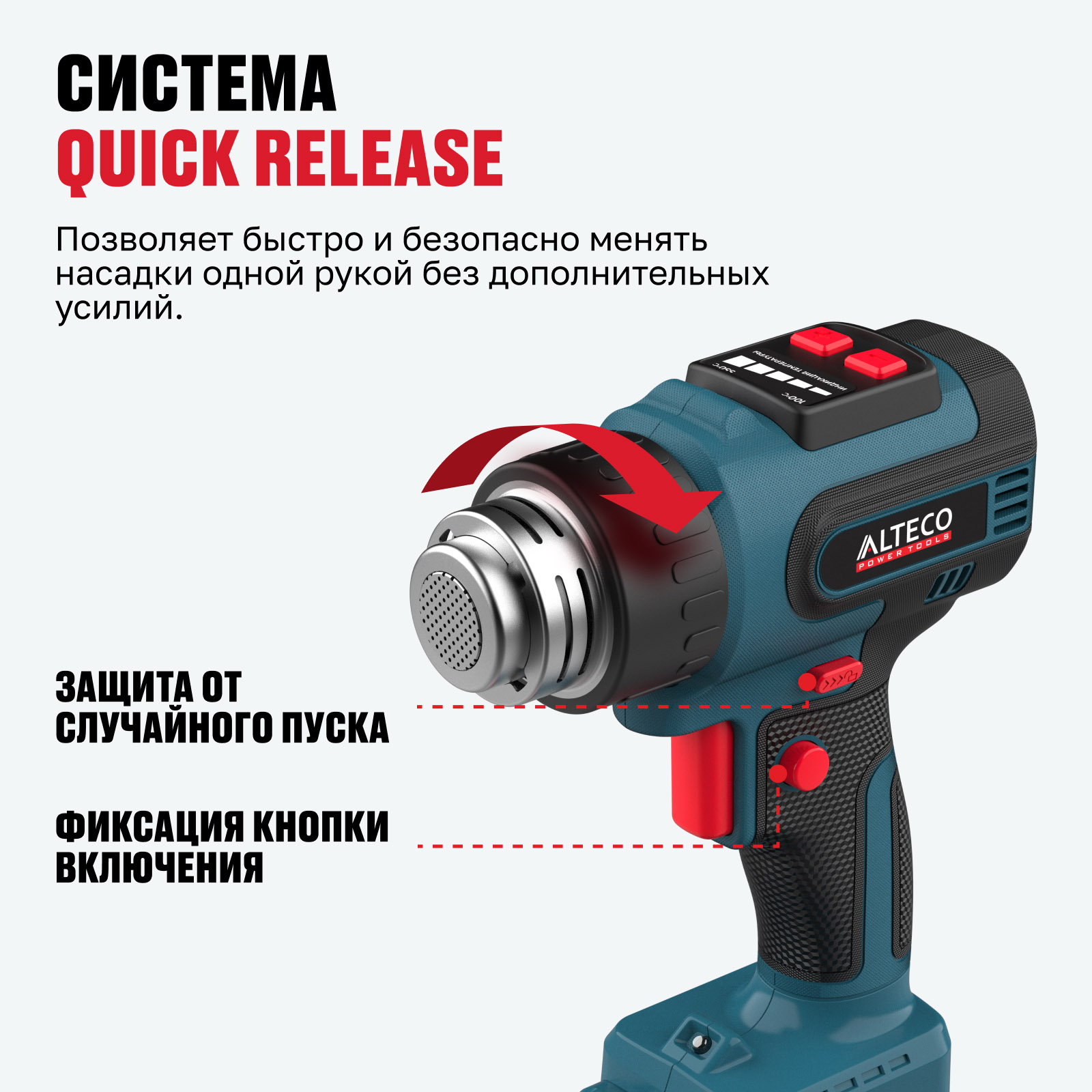 - Система Quick Release — позволяет быстро и безопасно менять насадки одной рукой без дополнительных усилий.