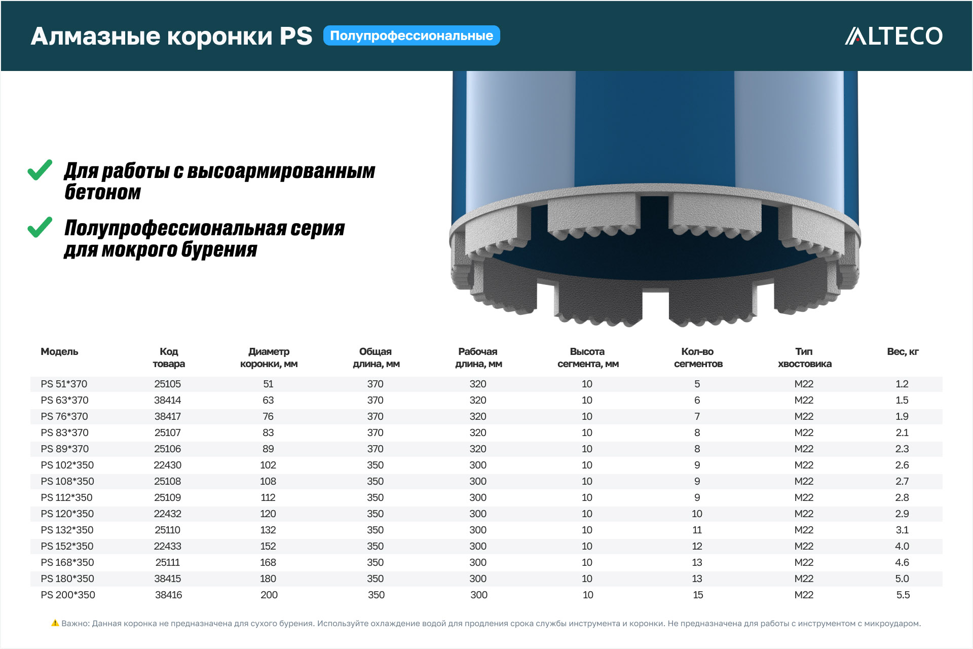 ⚠️ Важно: Данная коронка не предназначена для сухого бурения. Используйте охлаждение водой для продления срока службы инструмента и коронки. Не предназначена для работы с инструментом с микроударом.