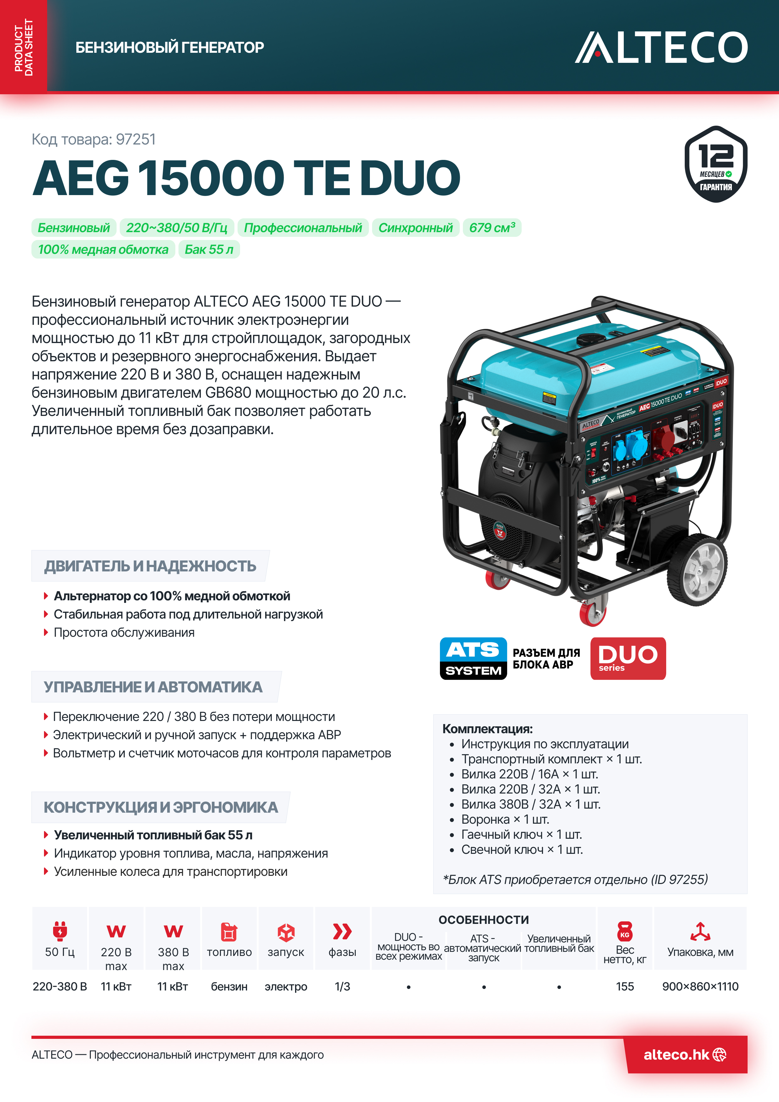 Линейка ALTECO DUO создана специально для работы с различным инструментом и оборудованием на строительных площадках, в ремонтных и аварийных бригадах, полиции и МЧС, в коммунальном секторе, а также для обеспечения основного электроснабжения коммерческих и жилищных объектов. Оборудование Alteco Professional отличается исключительной компактностью, надежностью и одним из лучших на рынке соотношением цены, качества, долговечности и надежности. Надежные бензиновые двигатели с воздушным охлаждением, обеспечивают длительную эксплуатацию электростанций и большой моторесурс.