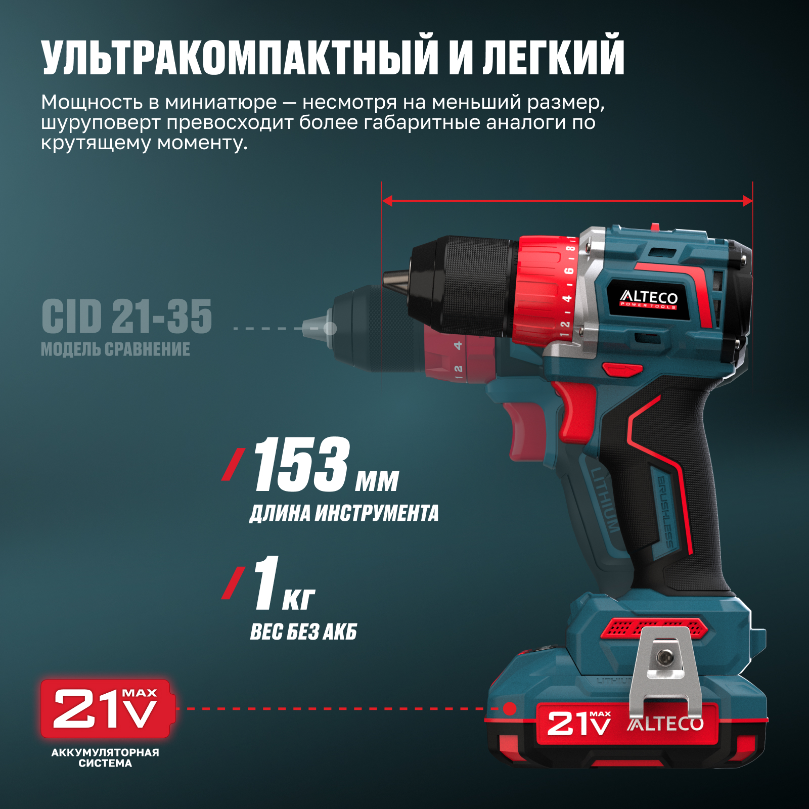 - Часть единой аккумуляторной системы ALTECO 21Vmax — один аккумулятор подходит для всех инструментов этой серии, обеспечивая удобство, экономию и гибкость в работе.