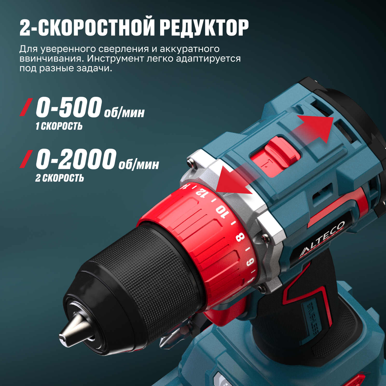 - 2 скорости — для уверенного сверления и аккуратного ввинчивания. Инструмент легко адаптируется под разные задачи.