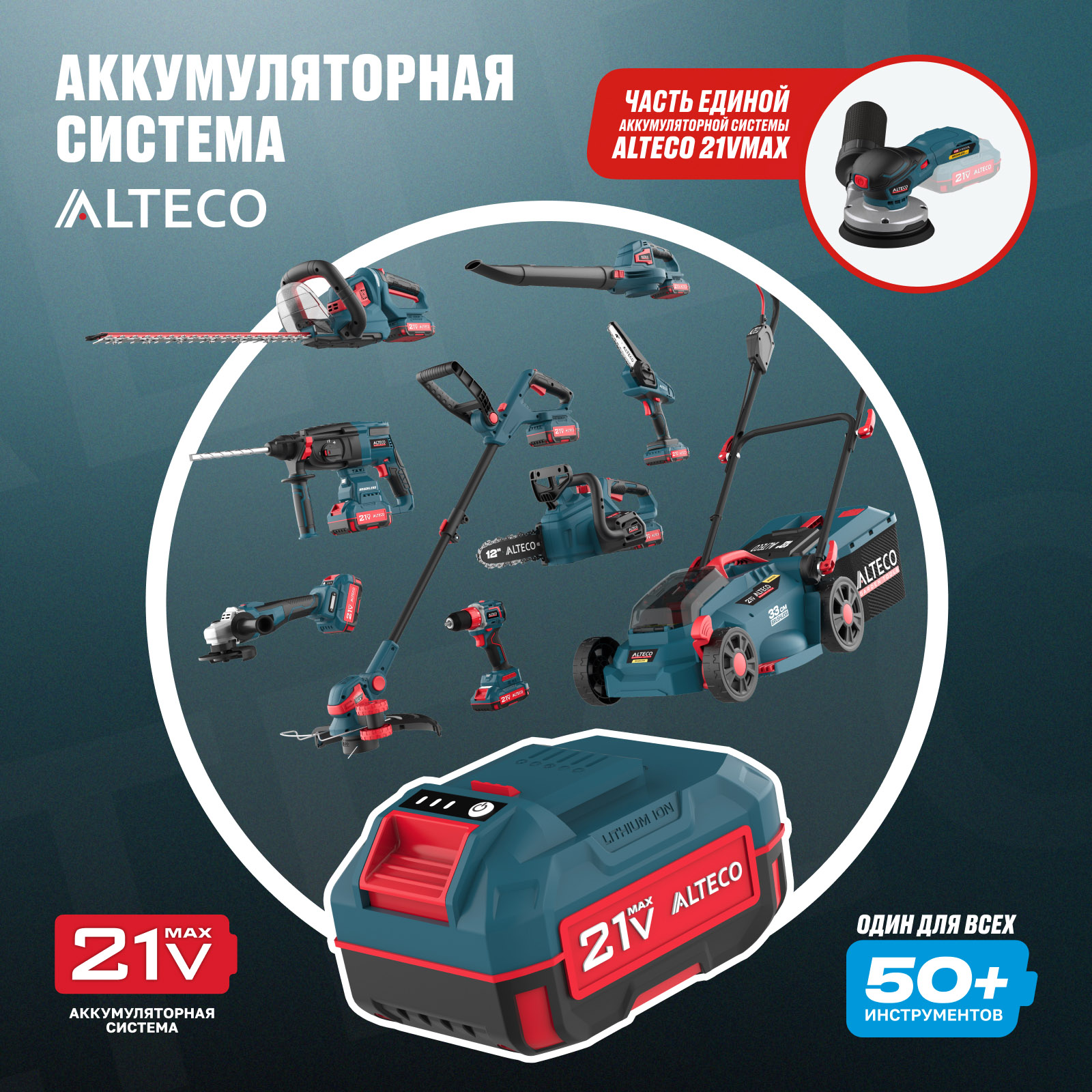 - Часть единой аккумуляторной системы ALTECO 21Vmax — один аккумулятор подходит для всех инструментов этой серии, обеспечивая удобство, экономию и гибкость в работе.