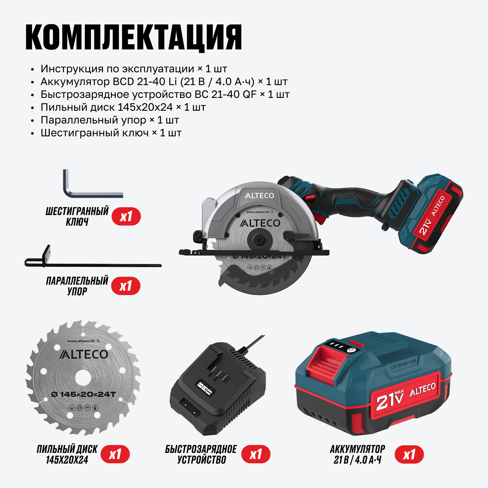 - Аккумулятор BCD 21-40 Li (21 В / 4.0 А·ч) × 1 шт.