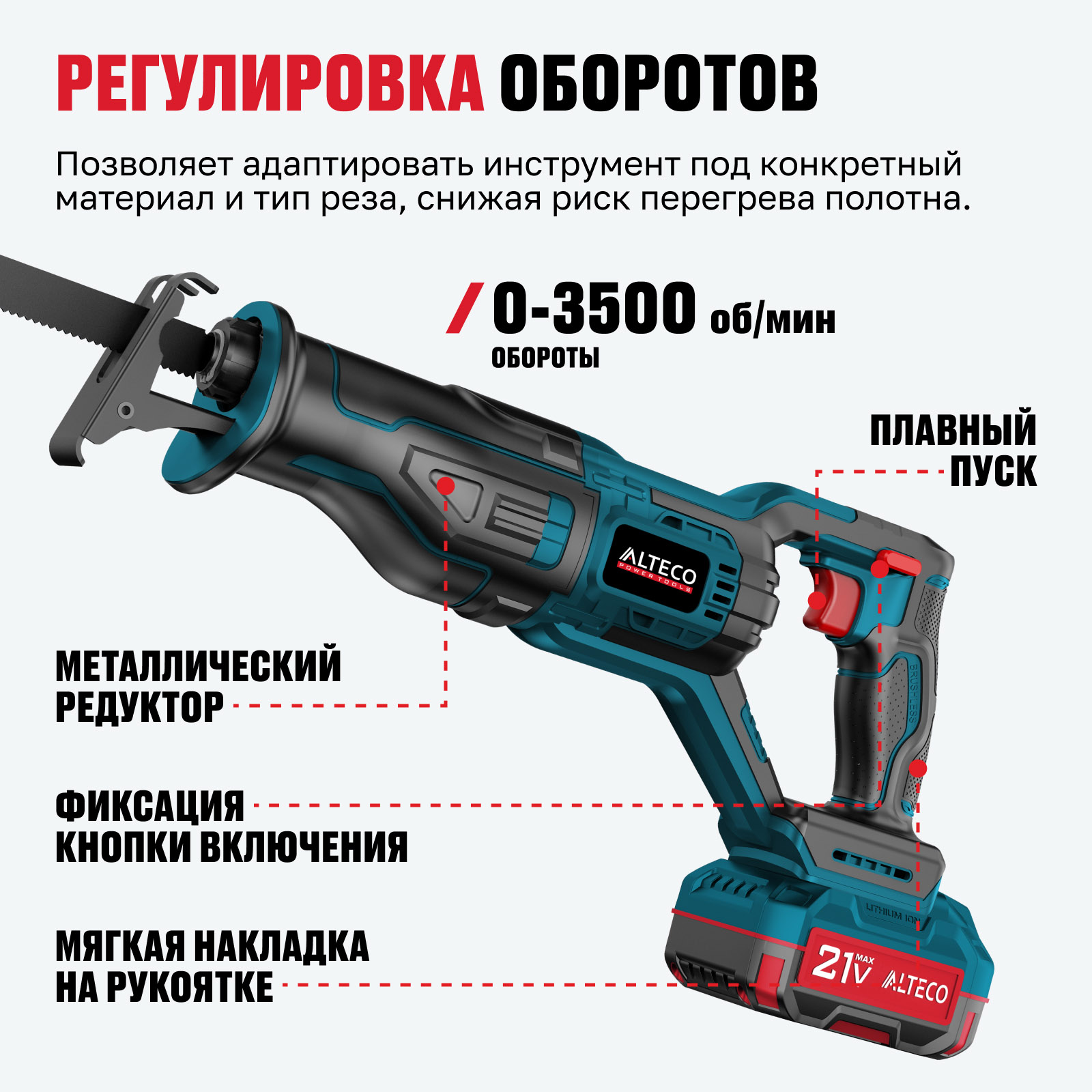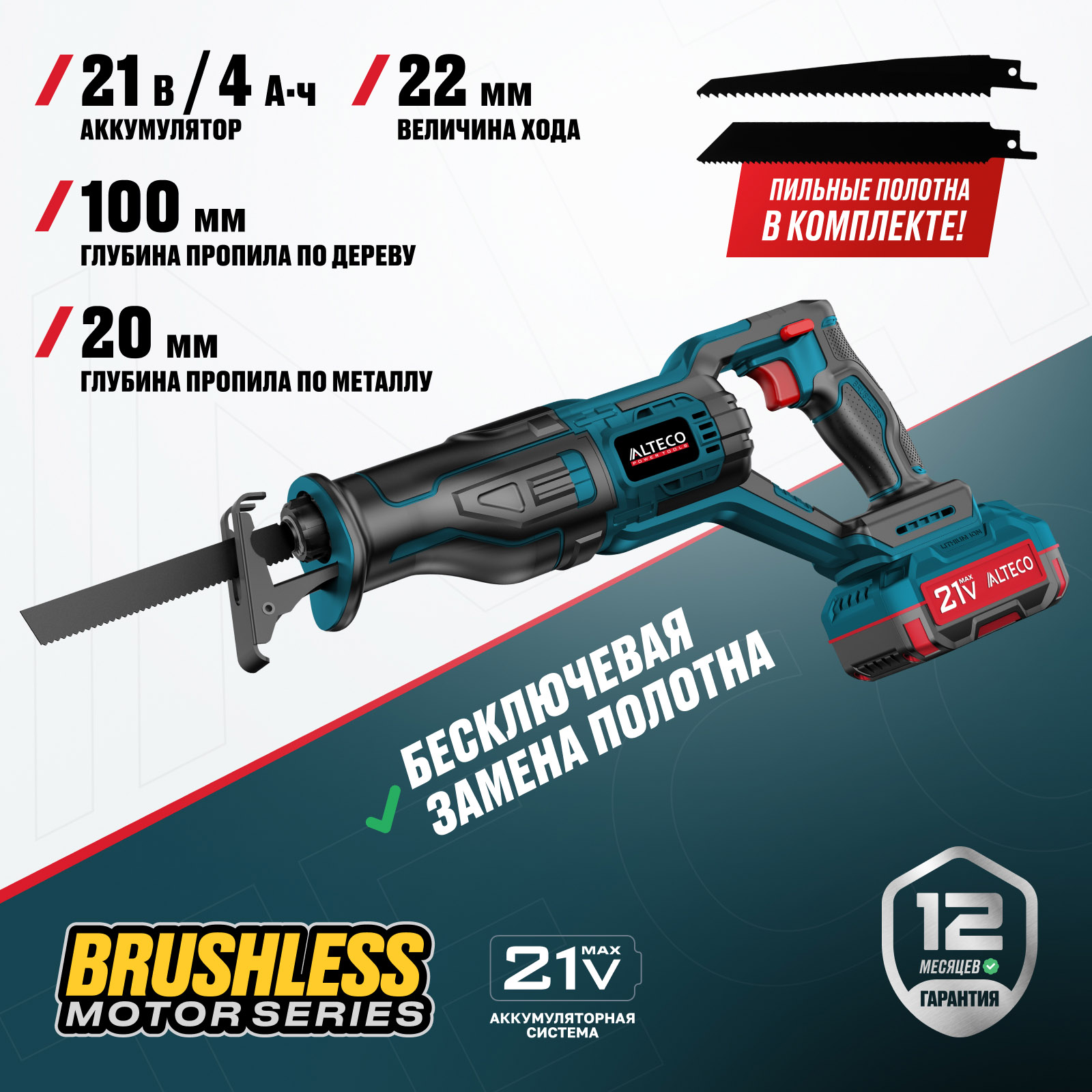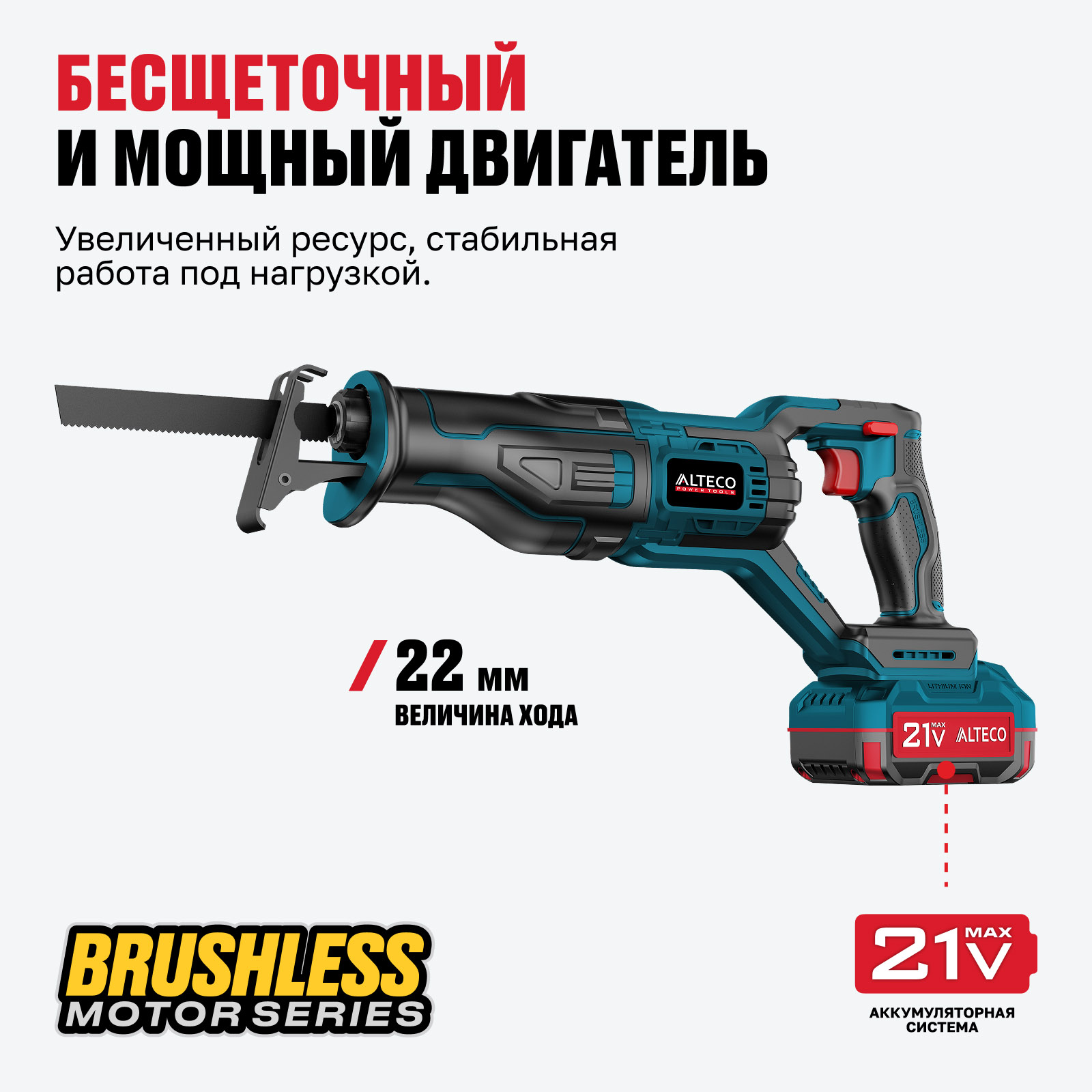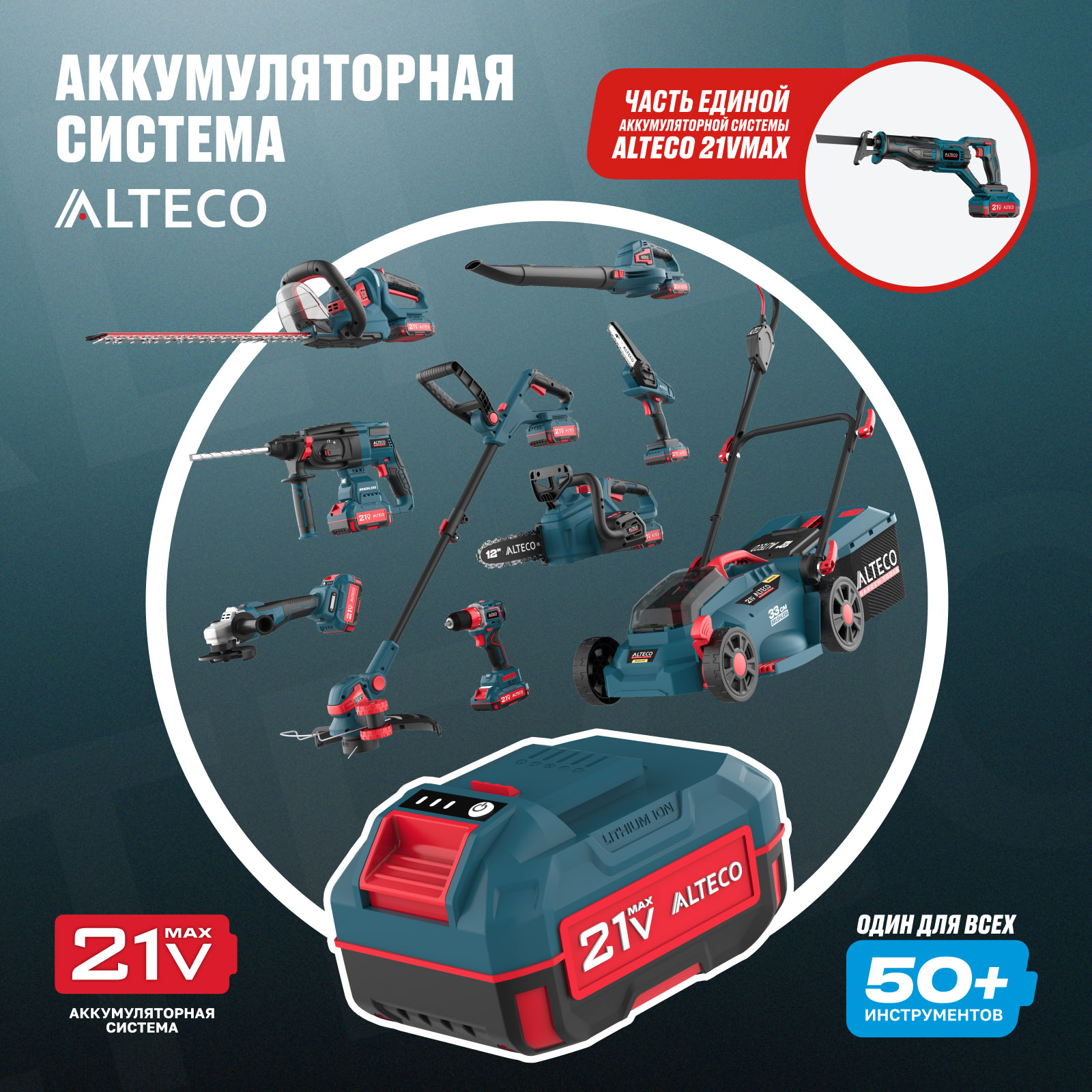 Часть единой аккумуляторной системы ALTECO 21Vmax — один аккумулятор подходит для всех инструментов этой серии, обеспечивая удобство, экономию и гибкость в работе.