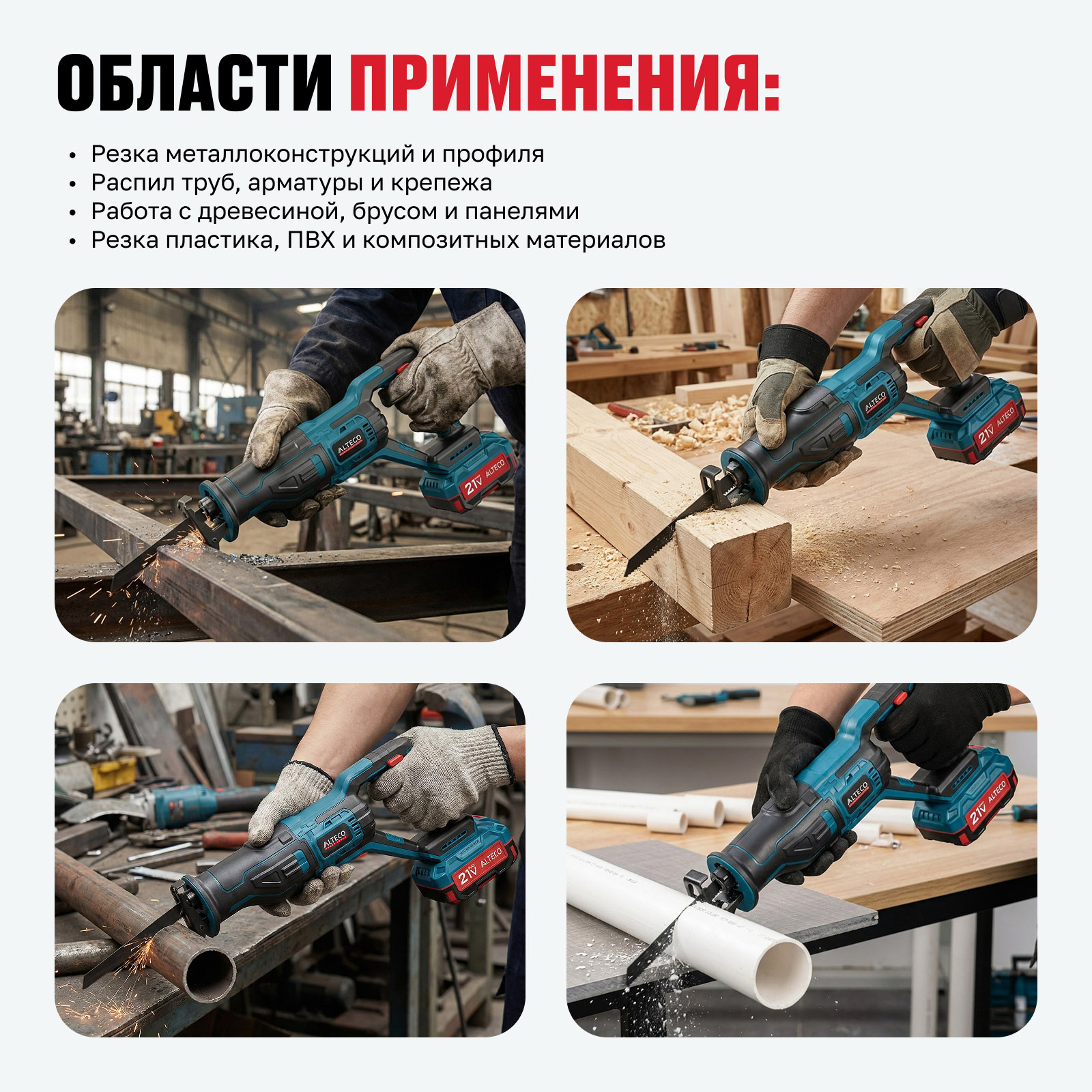 - Высокая скорость реза — обеспечивает быстрое прохождение древесины, металла, пластика и композитов, увеличивая общую производительность.