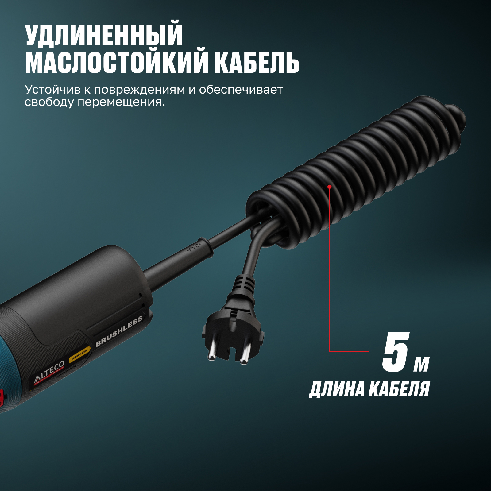 - Удлиненный маслостойкий кабель 5 м — устойчив к повреждениям и химическим веществам, обеспечивает свободу перемещения.