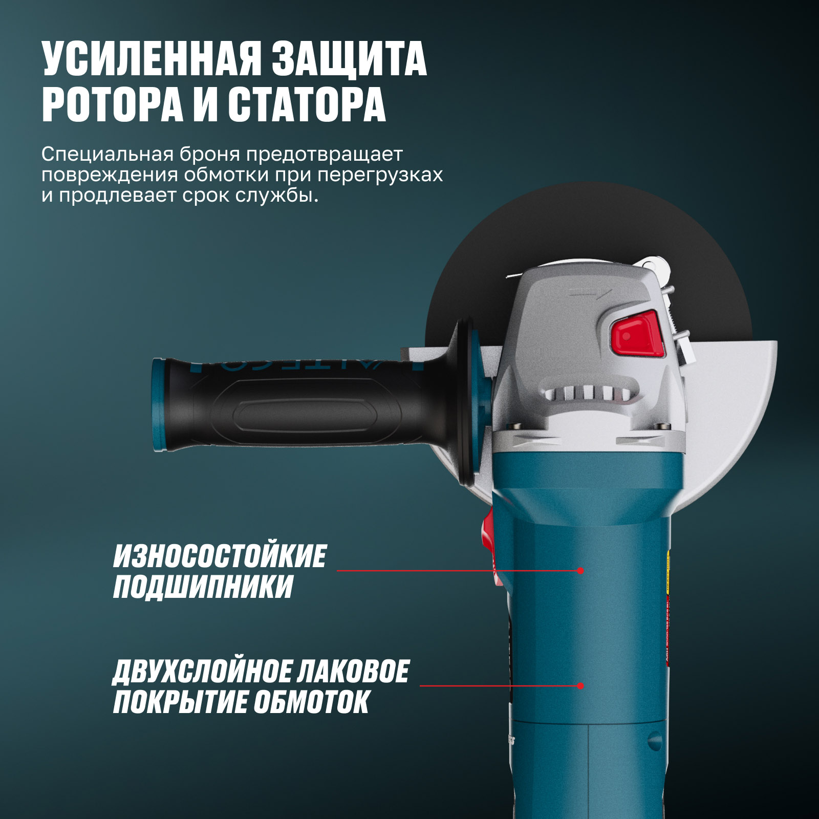 - Усиленная защита ротора и статора — специальная броня предотвращает повреждения обмотки при перегрузках и продлевает срок службы.