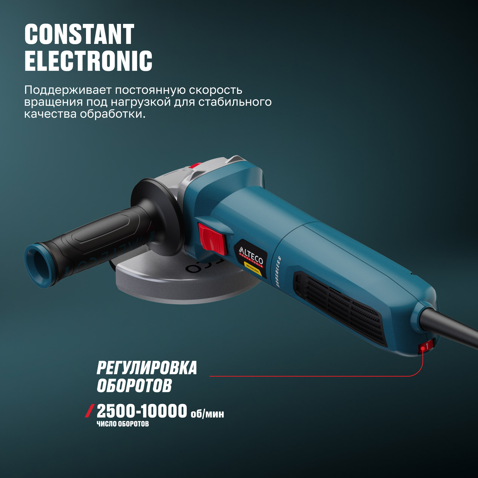 - Constant Electronic — поддерживает постоянную скорость вращения под нагрузкой для стабильного качества обработки.