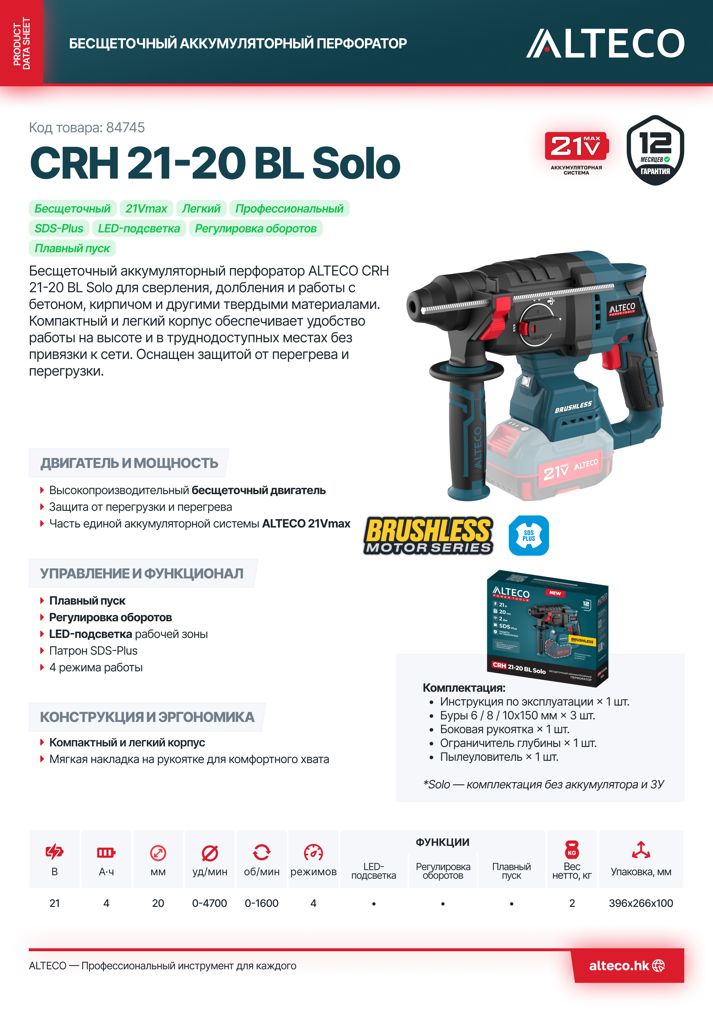 - Часть единой аккумуляторной системы ALTECO 21Vmax — один аккумулятор подходит для всех инструментов этой серии, обеспечивая удобство, экономию и гибкость в работе.