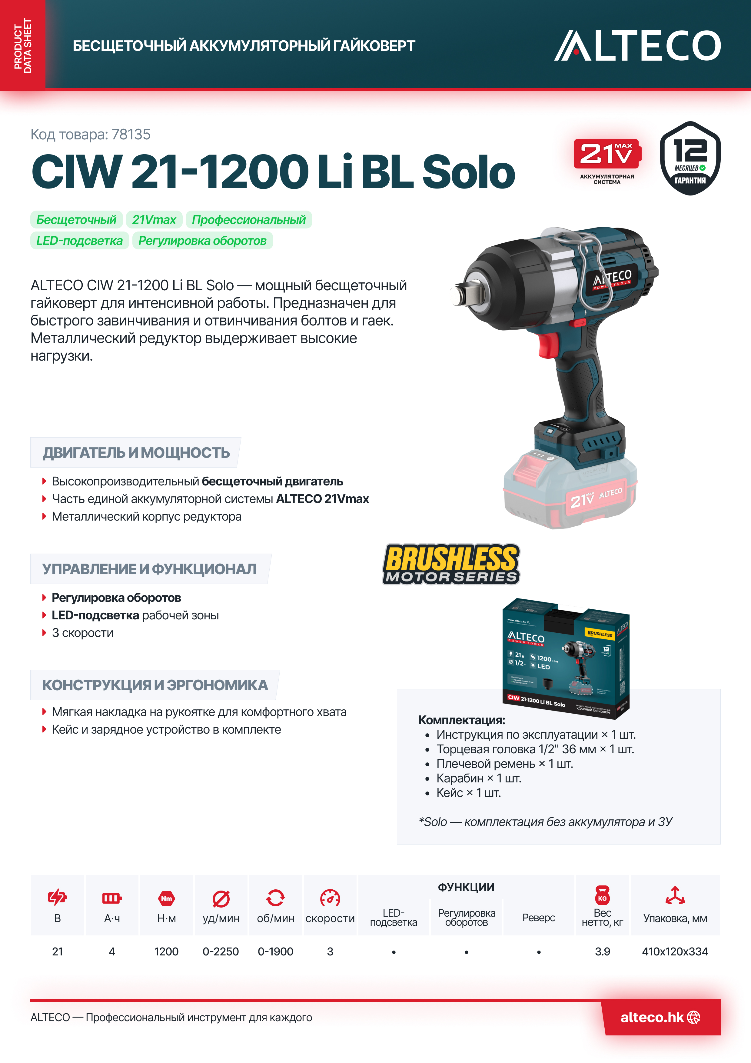 - Часть единой аккумуляторной системы ALTECO 21Vmax — один аккумулятор подходит для всех инструментов этой серии, обеспечивая удобство, экономию и гибкость в работе.