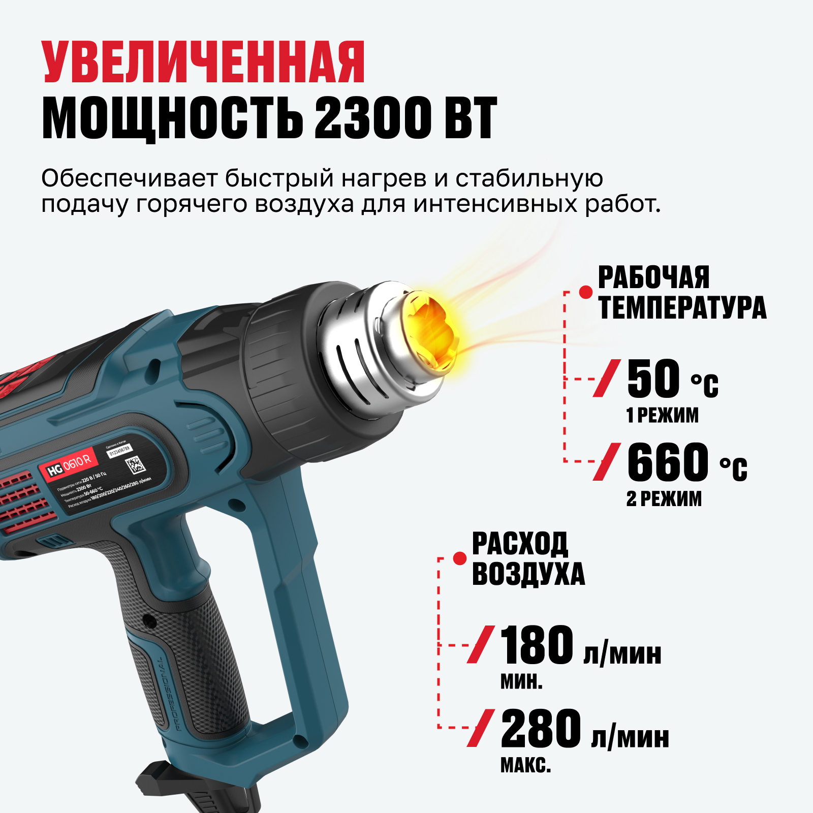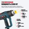 - Увеличенная мощность 2300 Вт — обеспечивает быстрый нагрев и стабильную подачу горячего воздуха для интенсивных работ.