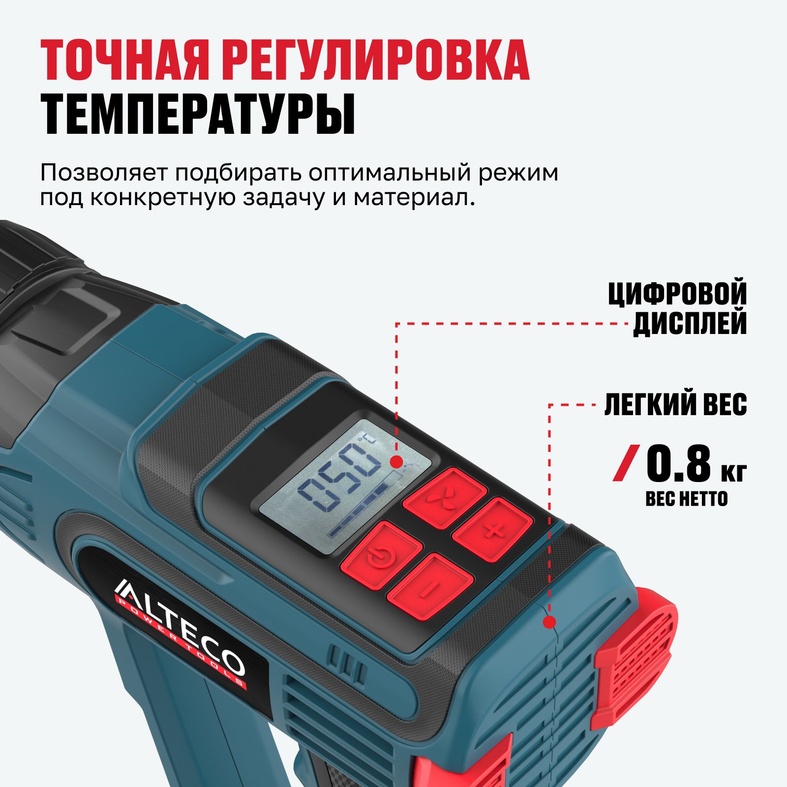 - Цифровой дисплей — отображает текущую температуру и скорость, повышая контроль и точность работы.