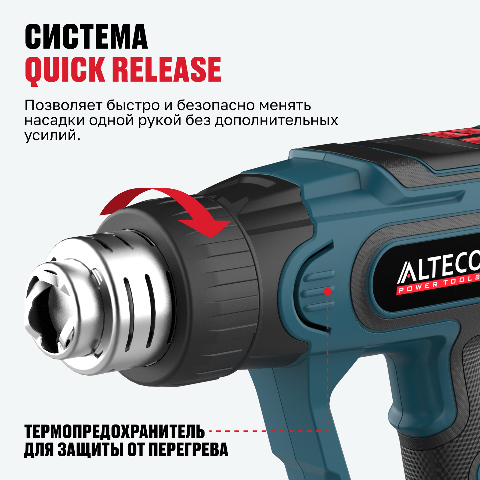 - Система Quick Release — позволяет быстро и безопасно менять насадки одной рукой без дополнительных усилий.
