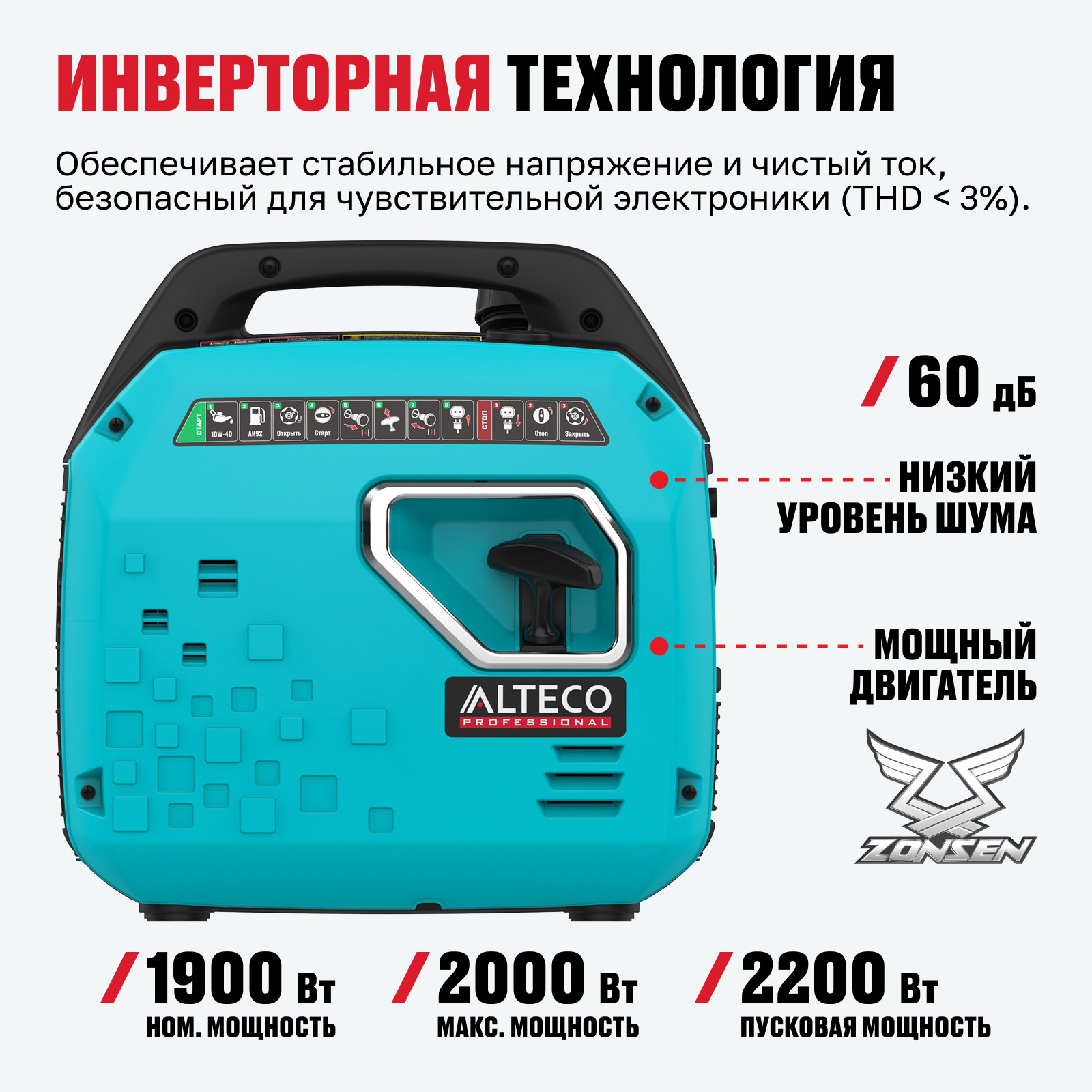 - Инверторная технология — обеспечивает стабильное напряжение и чистый ток, безопасный для чувствительной электроники (THD < 3%).