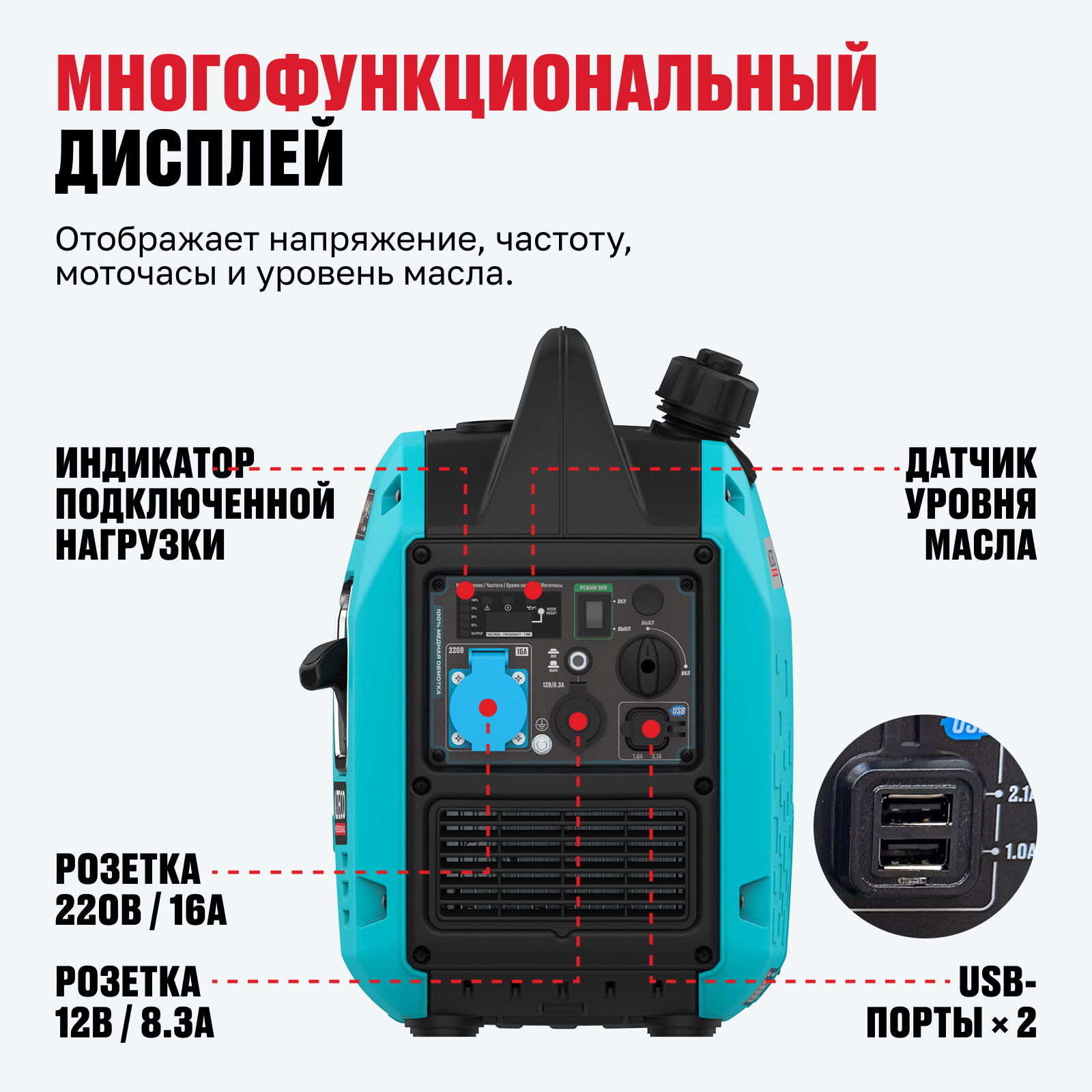 - Индикатор подключенной нагрузки — позволяет контролировать текущую нагрузку и предотвращать перегрузку генератора.
