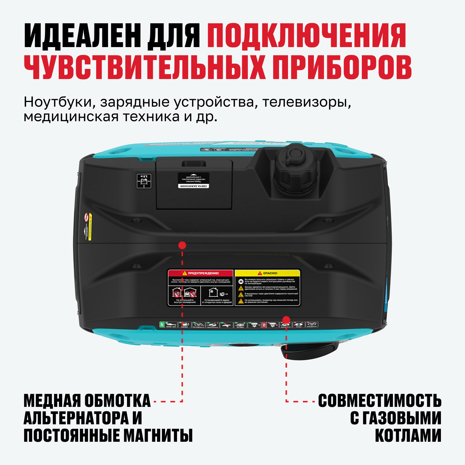 - Инверторная технология — обеспечивает стабильное напряжение и чистый ток, безопасный для чувствительной электроники (THD < 3%).