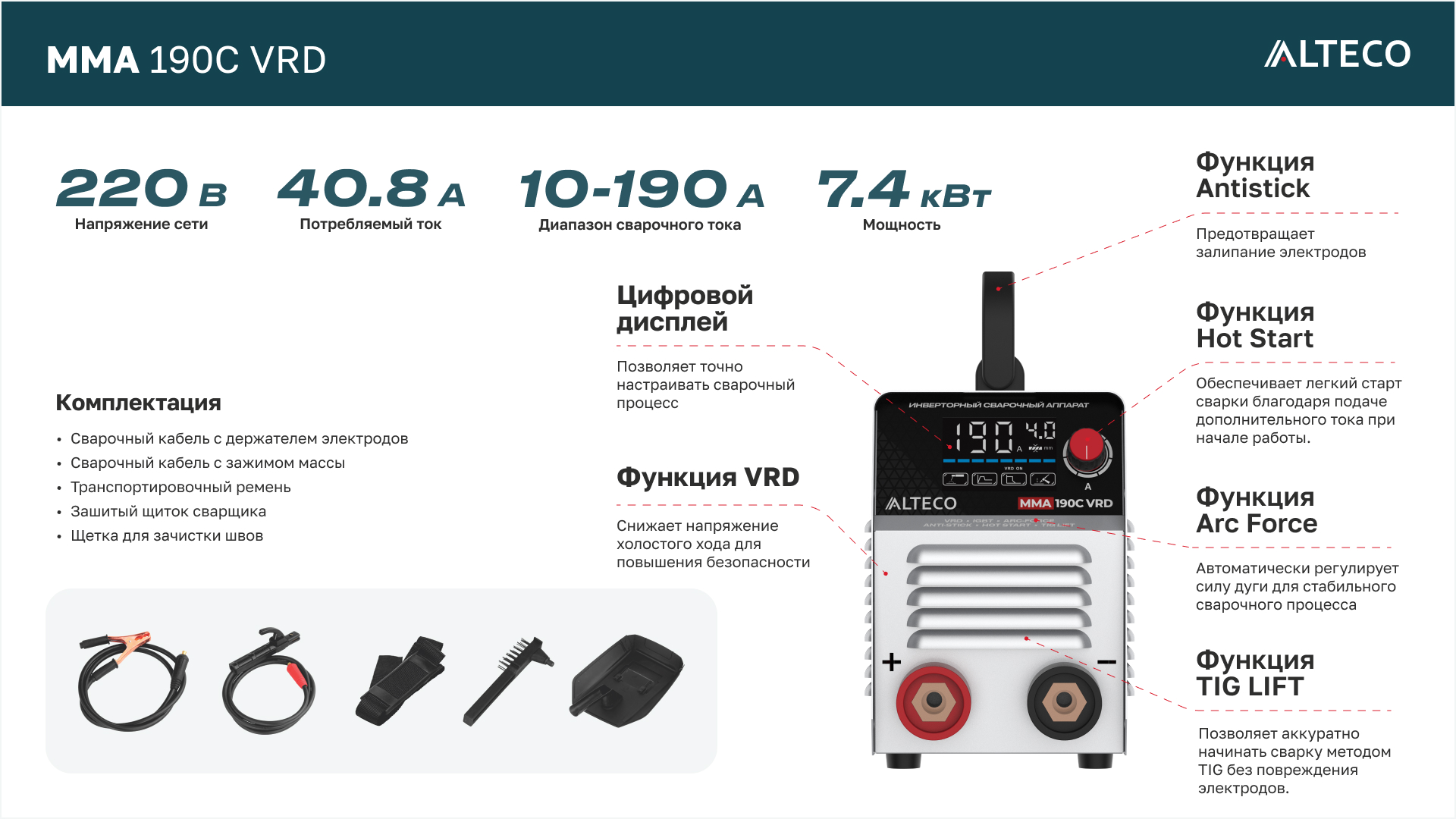 - Функция VRD – снижает напряжение холостого хода для повышения безопасности, уменьшая риск удара током во время простоя