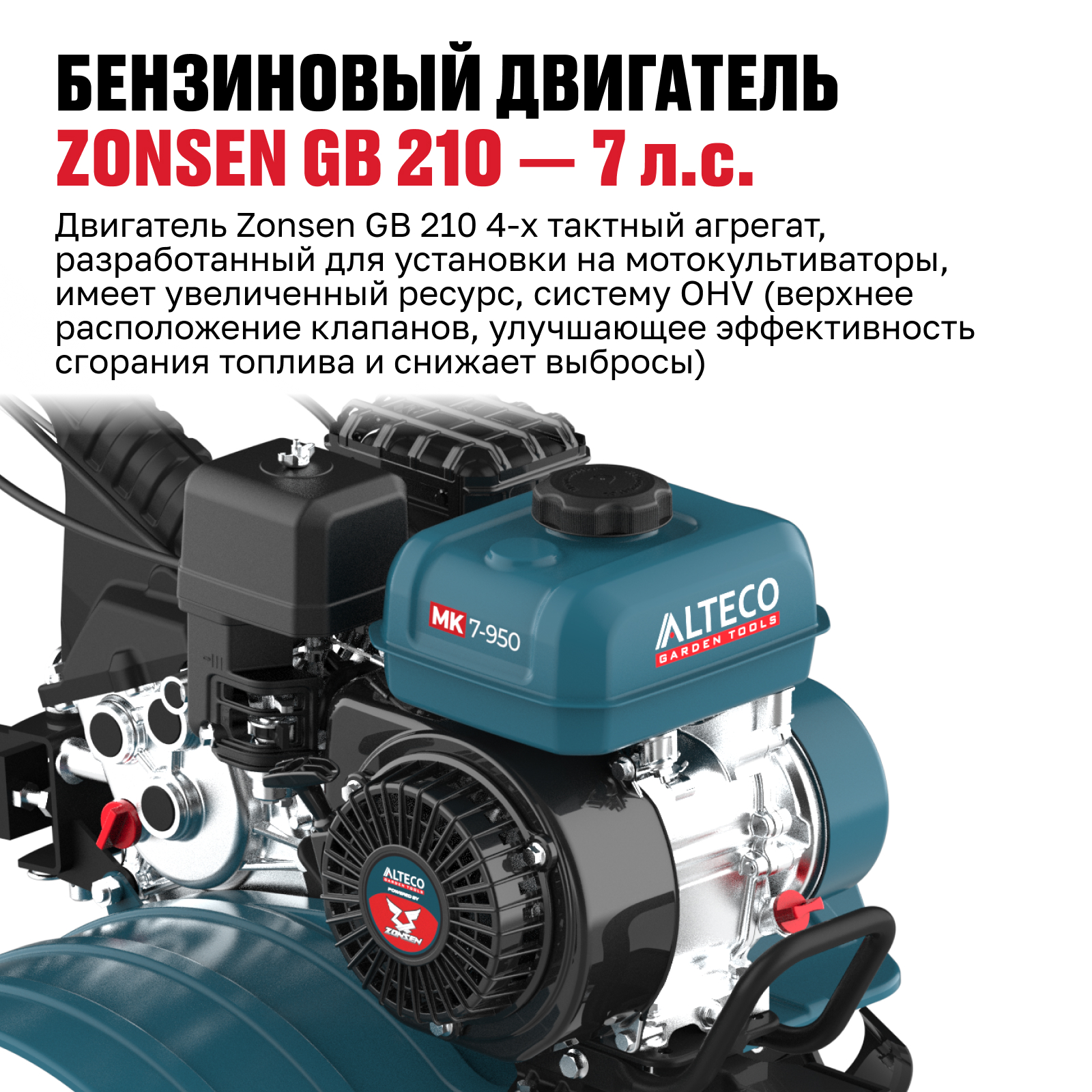- Двигатель Zonsen GB 210 4-х тактный агрегат, разработанный для установки на мотокультиваторы, имеет увеличенный ресурс, систему OHV (верхнее расположение клапанов, улучшающее эффективность сгорания топлива и снижает выбросы)