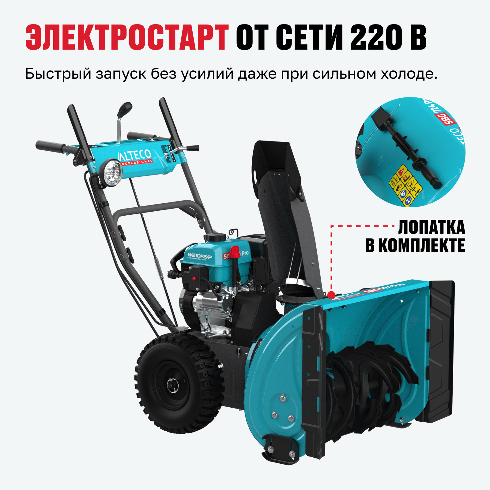- Лопатка в комплекте — удобная очистка выбросного желоба от наледи и снега.