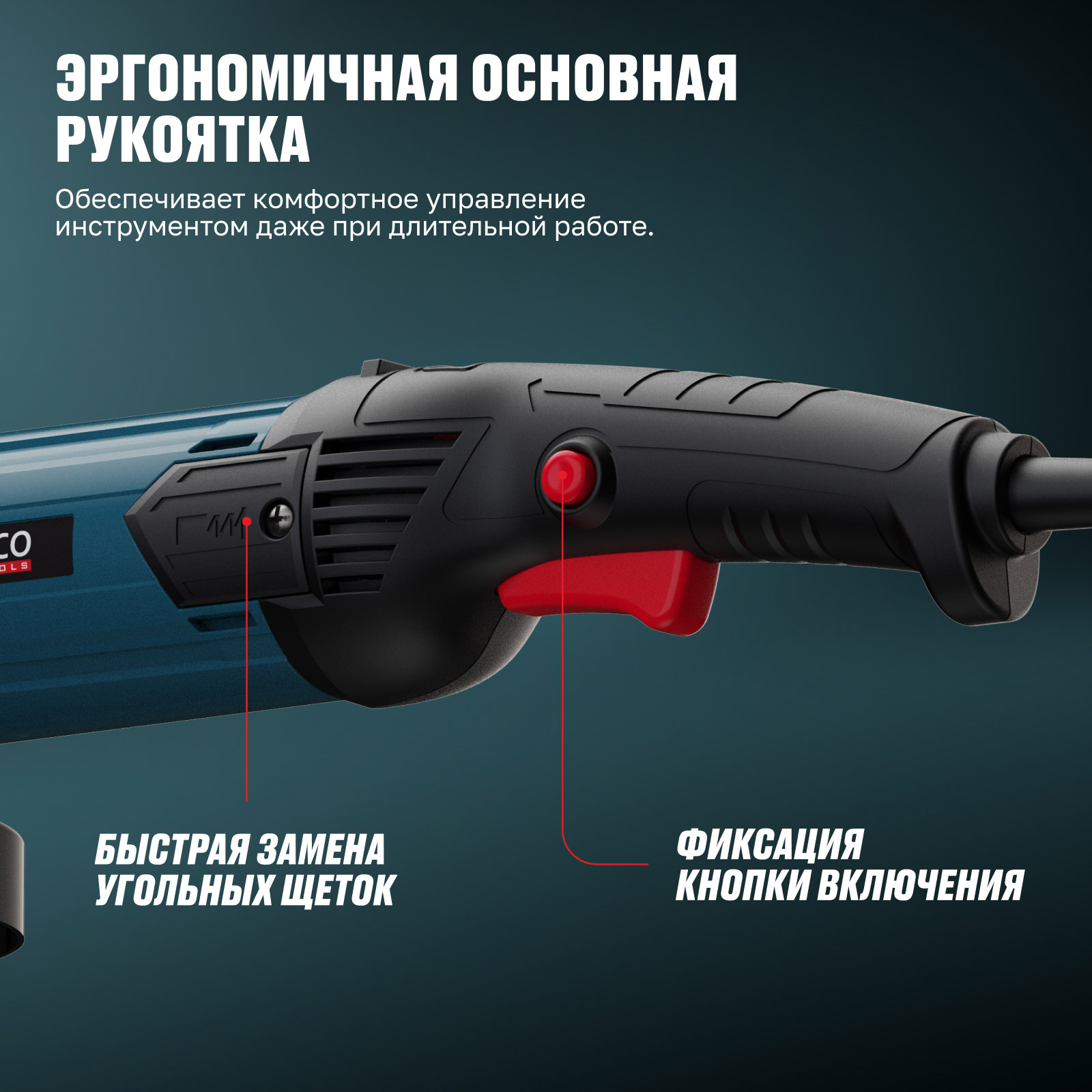 - Эргономичная основная рукоятка — обеспечивает комфортное управление инструментом даже при длительной работе.
