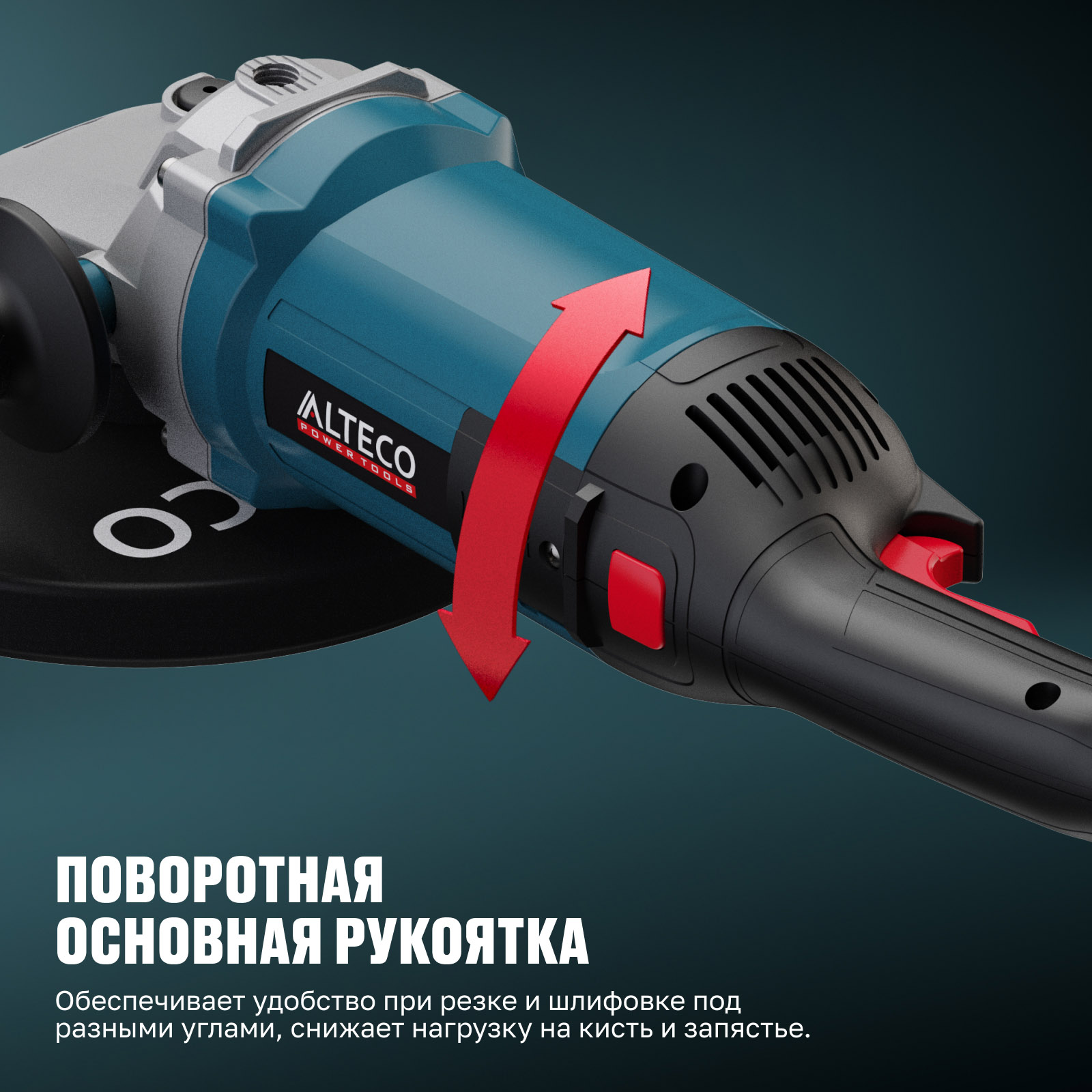 - Поворотная основная рукоятка — обеспечивает удобство при резке и шлифовке под разными углами, снижает нагрузку на кисть и запястье.