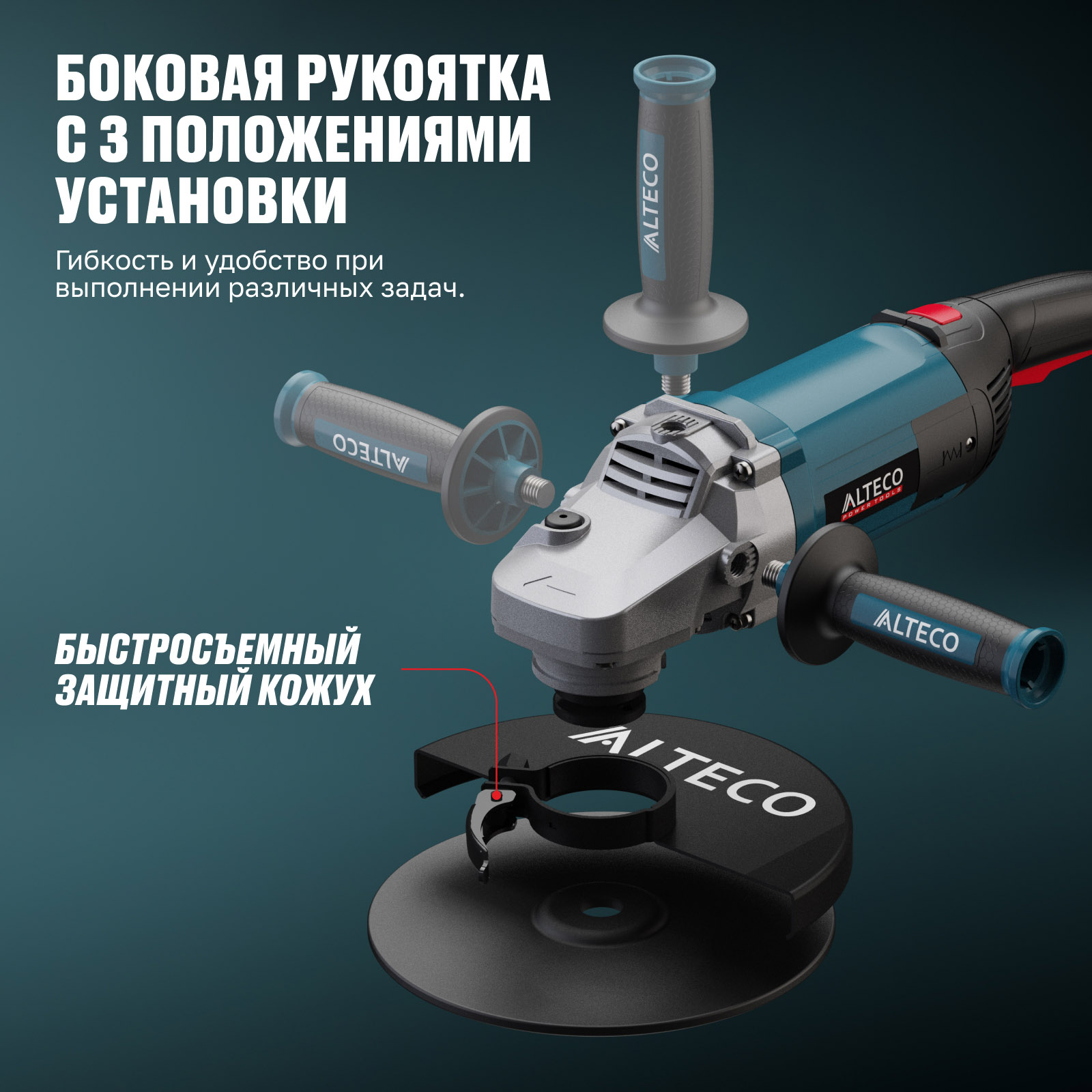 - Боковая рукоятка с 3 положениями установки — гибкость и удобство при выполнении различных задач.