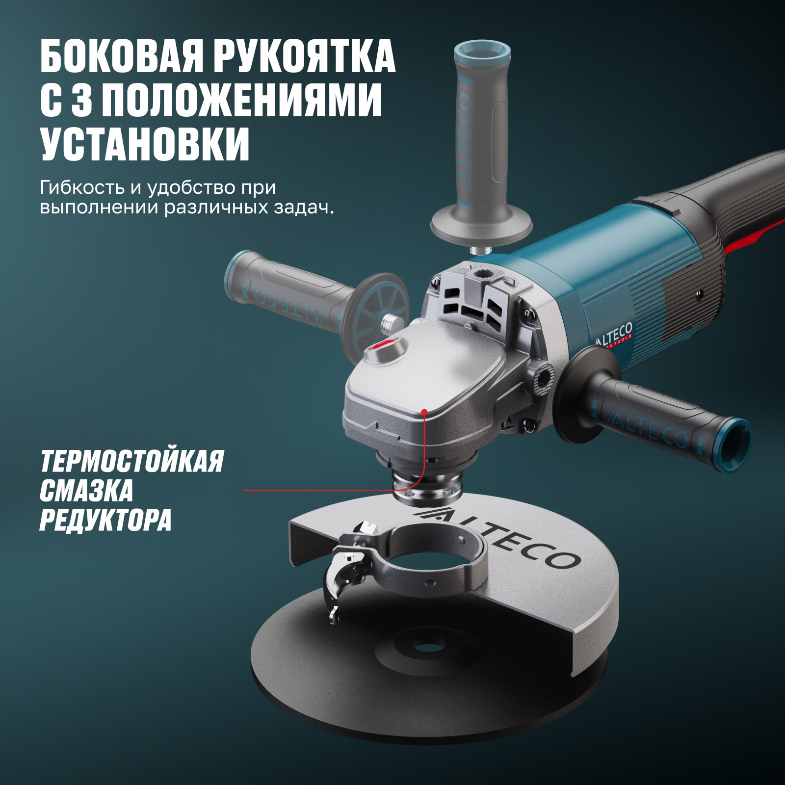 - Дополнительная рукоятка с 3 положениями установки — гибкость и удобство при выполнении различных задач.