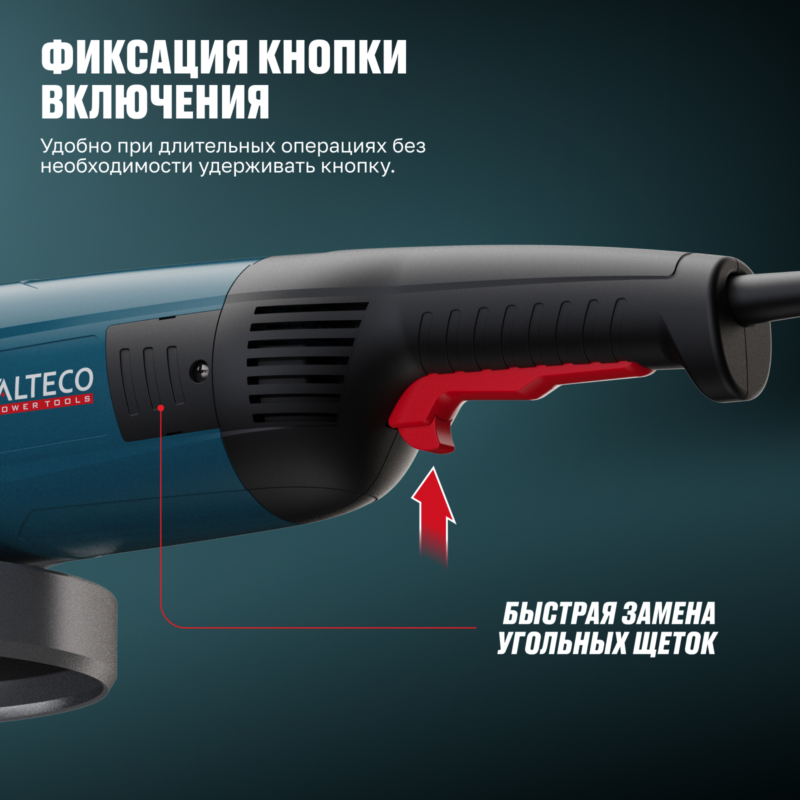 - Фиксация кнопки включения — удобно при длительных операциях без необходимости удерживать кнопку.
