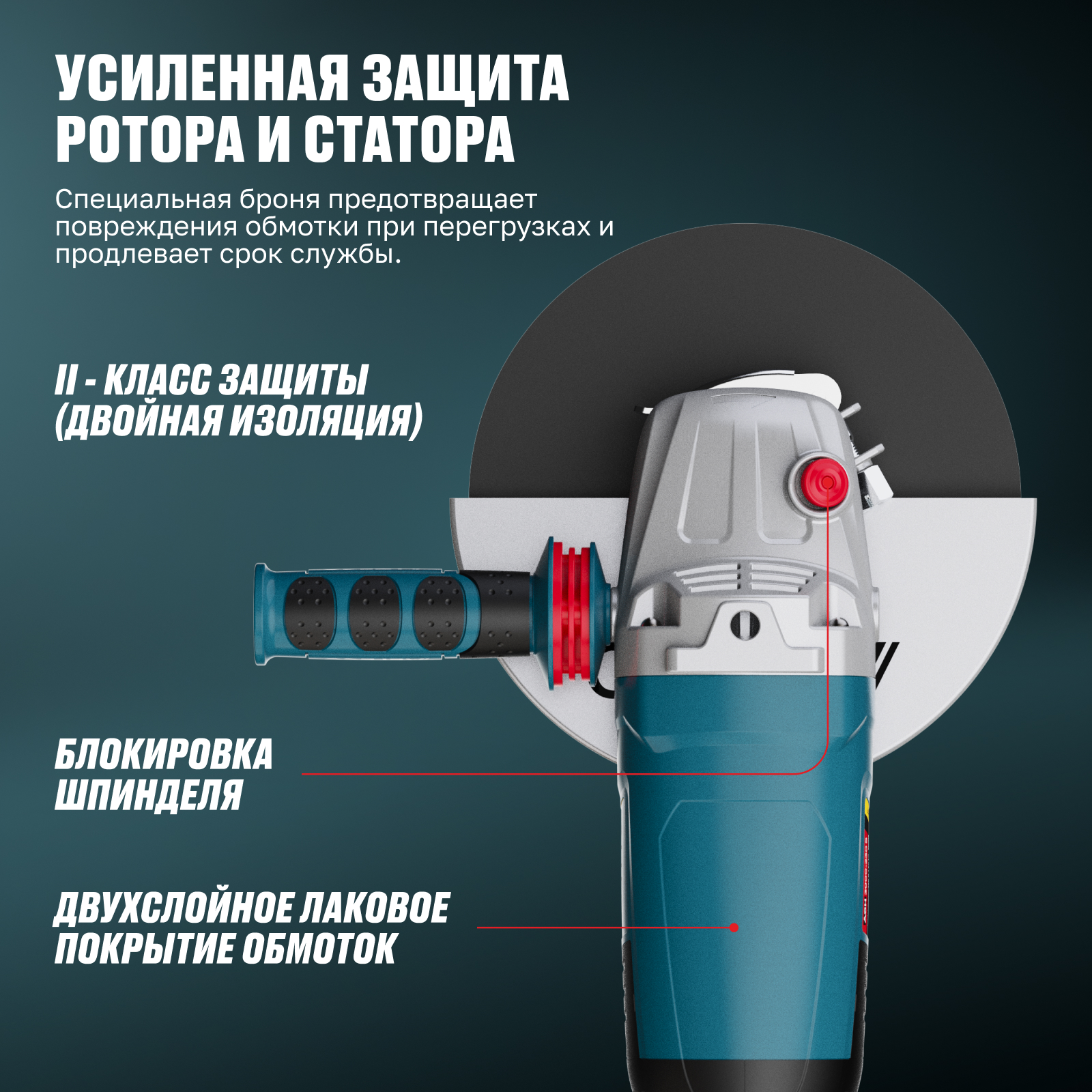 - Усиленная защита ротора и статора — специальная броня предотвращает повреждения обмотки при перегрузках и продлевает срок службы.