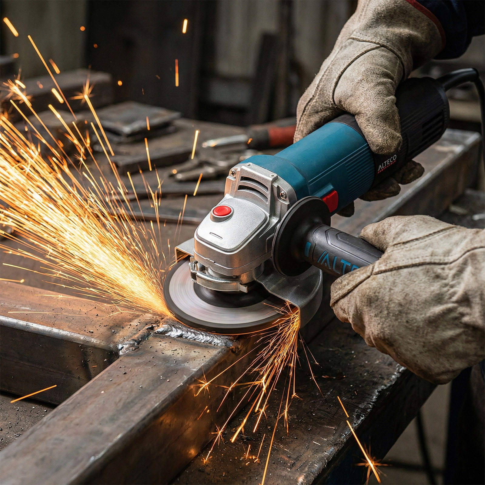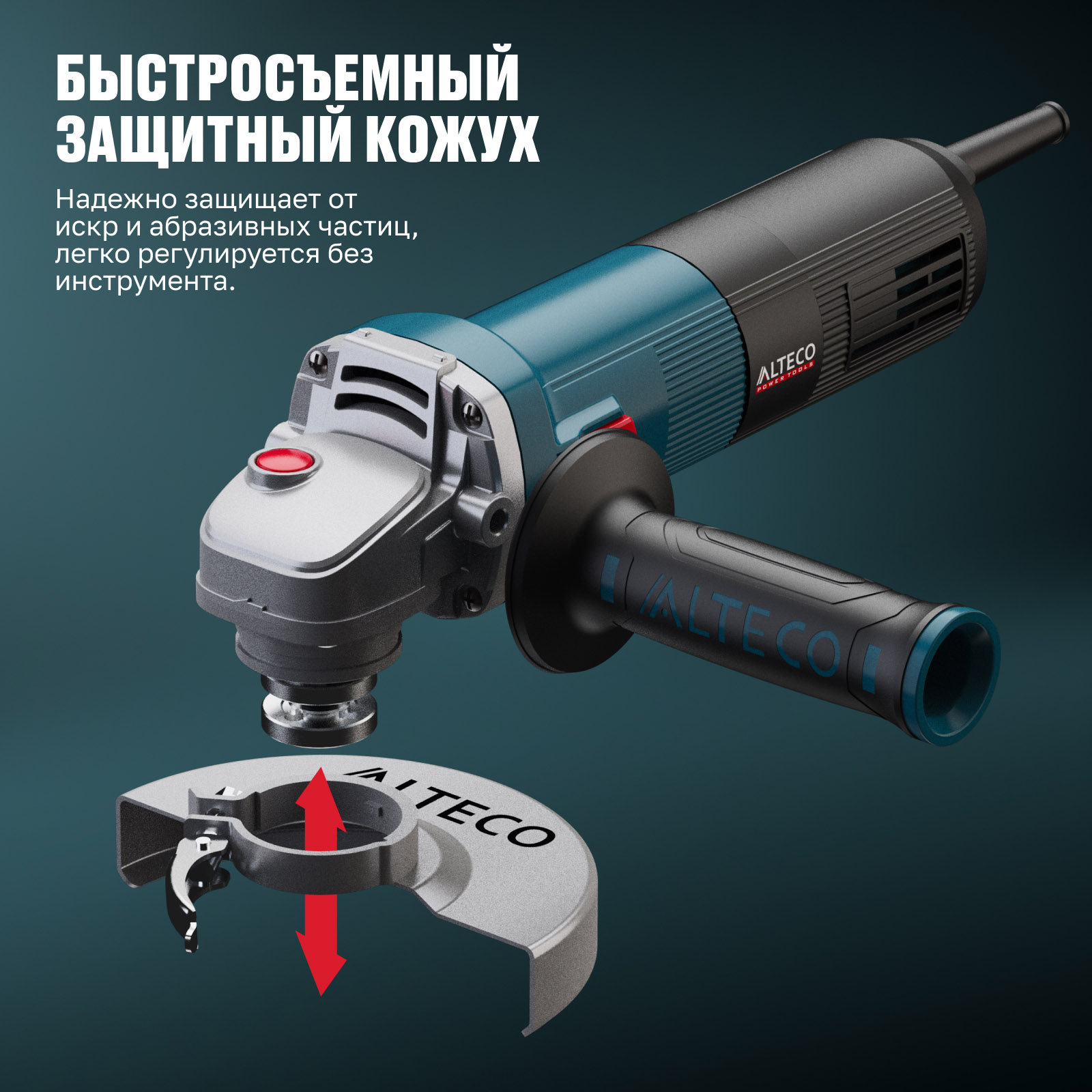 - Быстросъемный защитный кожух — надёжно защищает от искр и абразивных частиц, легко регулируется без инструмента.