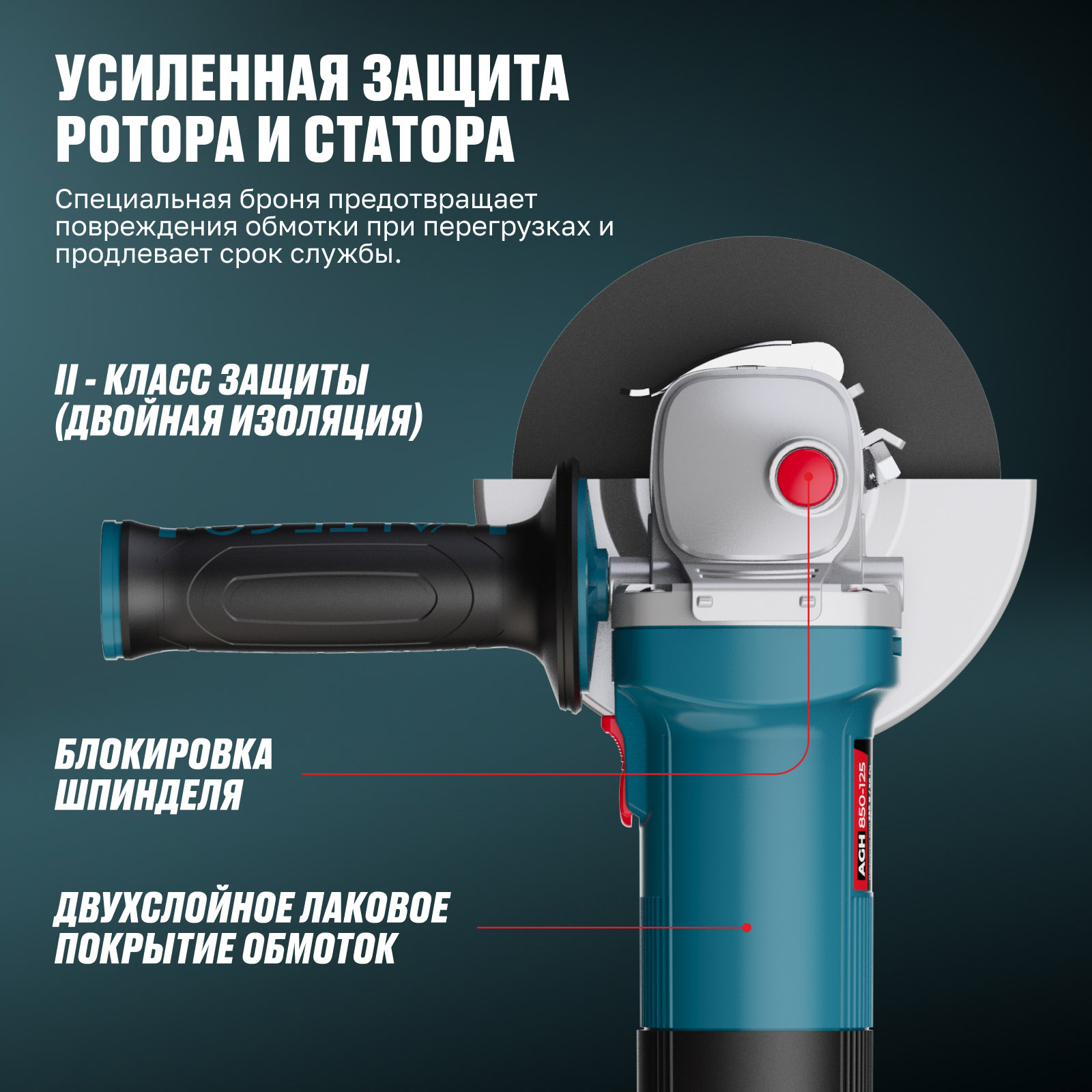 - Усиленная защита ротора и статора — специальная броня предотвращает повреждения обмотки при перегрузках и продлевает срок службы.