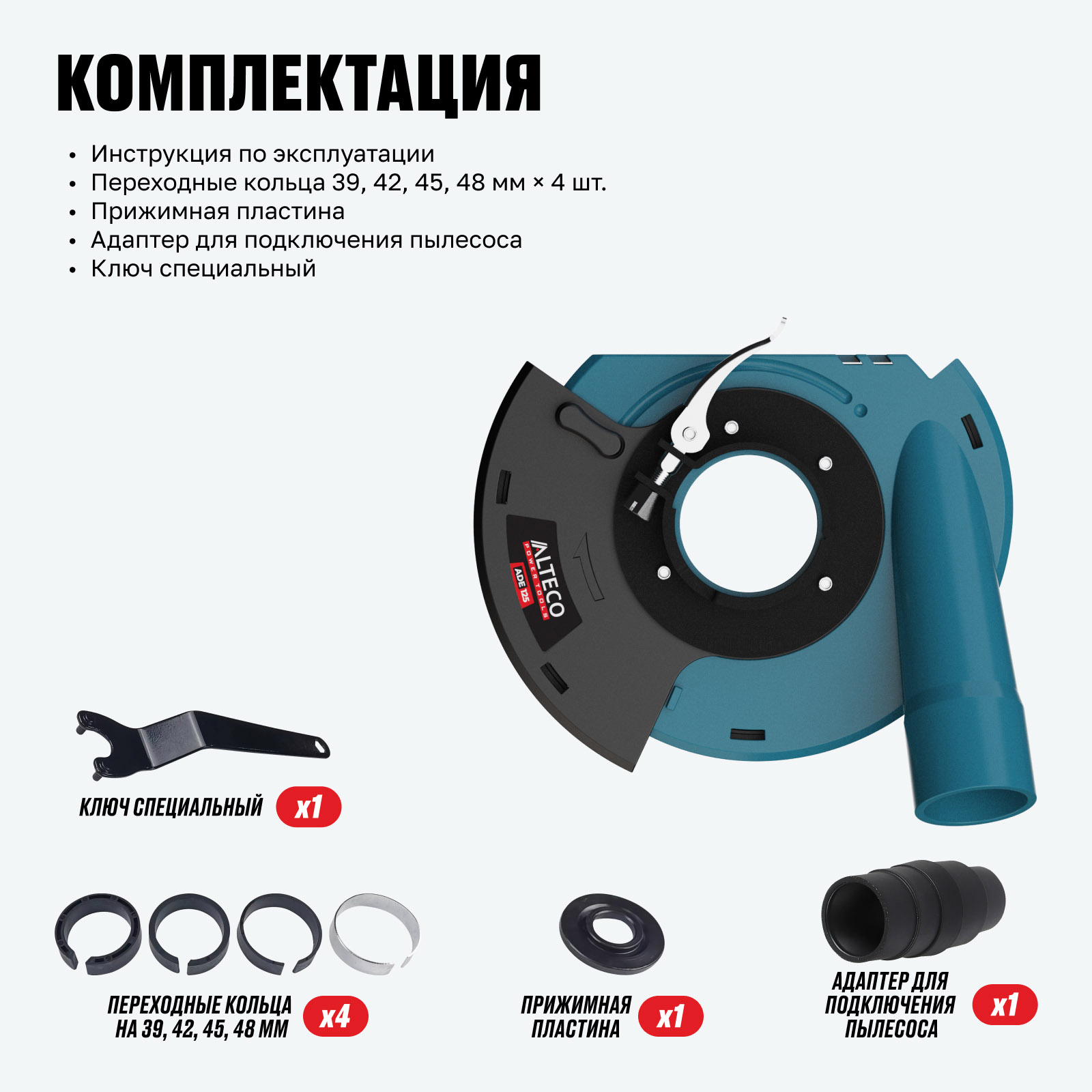 - Комплект переходных колец — обеспечивает удобную установку кожуха на углошлифовальные машины разных типоразмеров.